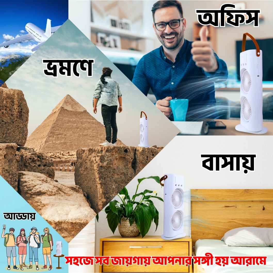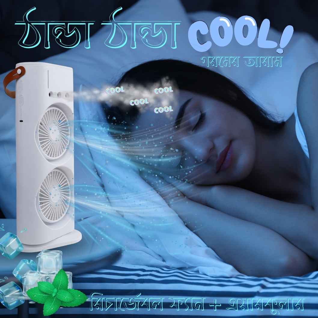 বিশেষ বৈশিষ্ট্য পোর্টেবল এবং লাইট ওয়েট, রিমোট কন্ট্রোল নিয়ন্ত্রিত, রিচার্জেবল এয়ারকুলার ফ্যান।সাত রঙা আলোয় রাঙান্নিত!!!